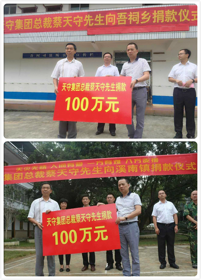洪水無(wú)情人有情,大災(zāi)面前有大愛。天守集總裁蔡天守先生及時(shí)向?yàn)?zāi)區(qū)人民伸出援手,為溪南鎮(zhèn)、吾祠鄉(xiāng)各捐贈(zèng)100萬(wàn)元善款,用于災(zāi)后重建。