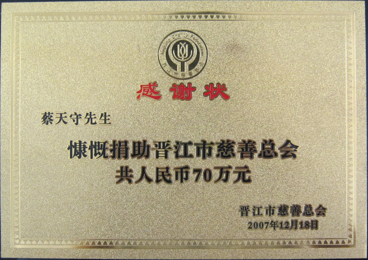 2007年12月,天守董事長(zhǎng)蔡天守先生向晉江市慈善總會(huì)捐贈(zèng)70萬(wàn)元。