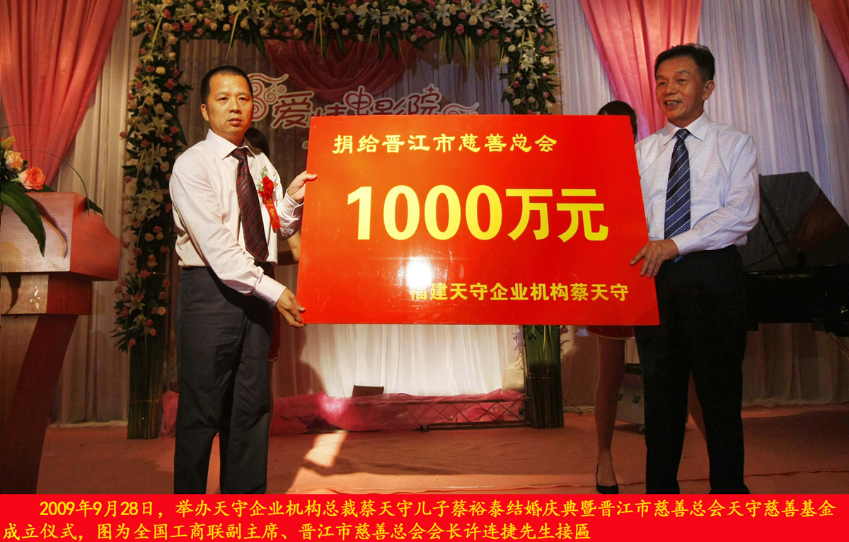 2009年9月28日,晉江市慈善總會(huì)天守慈善基金成立,天守集團(tuán)董事長(zhǎng)蔡天守先生
