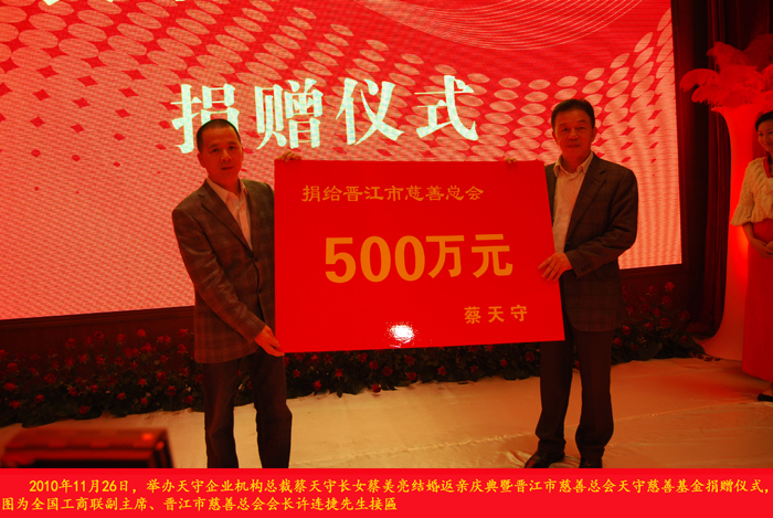2010年11月26日,天守集團(tuán)董事長(zhǎng)蔡先生向晉江市慈善總會(huì)天守慈善基金捐贈(zèng)500萬(wàn)元。
